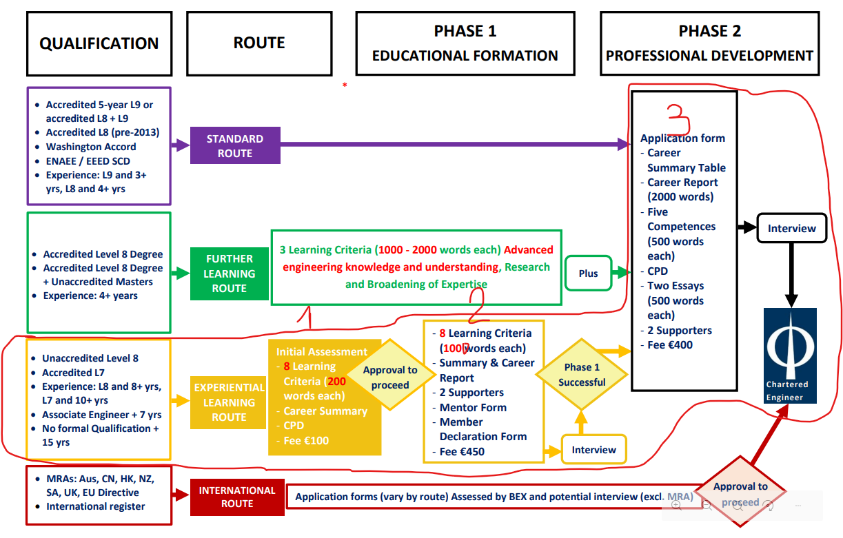 In Ireland, a rather unstructured pathway allows the engineer to demonstrate technical competence, leadership, and commitment to ethical practice in an application for Chartered Engineer status. An award from Engineers Ireland, it stands as a much-revered qualification among the Irish engineering fraternity. All qualifying requires specific eligibility and a complete series of actions evaluating academic background and professional experience along with competence. Broadly speaking, the steps are: